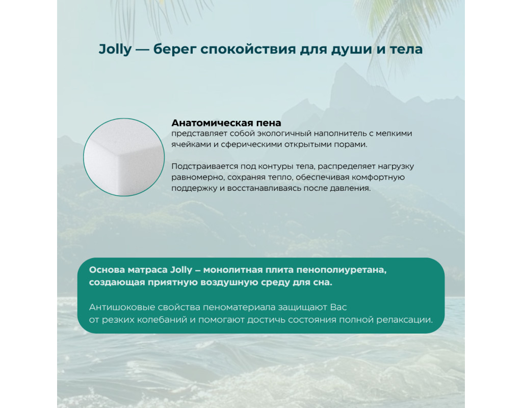 Основа матраса Jolly – монолитная плита пенополиуретана, создающая приятную воздушную среду для сна. Антишоковые свойства пеноматериала защищают вас от резких колебаний и помогают достичь состояния полной релаксации.