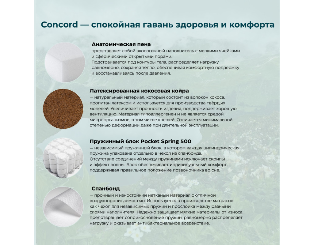 Concord очаровывает своими полезными качествами, вдохновленными чистотой полей и красотой природных ландшафтов. Выбирайте Concord и получите билет в райские уголки сна и здоровья.