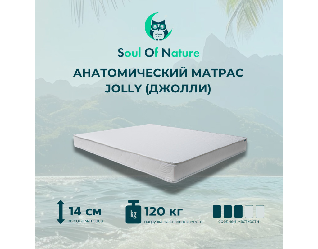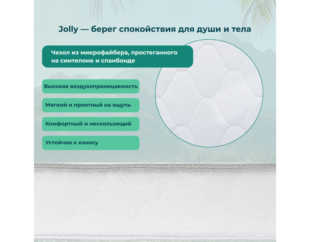 Добро пожаловать в волшебное путешествие по волнам комфортной ночи с матрасом Jolly. Подобно тёплому морскому бризу, он радует разумным сочетанием цены и качества, гарантируя прекрасное настроение с самого утра.