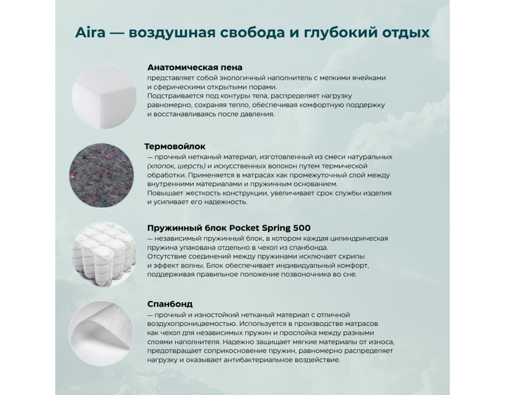 Почувствуйте живительную прохладу чистого воздуха и глубину спокойного сна с матрасом Aira.