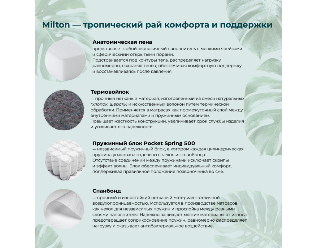 Поселите кусочек солнца и сочности тропиков у себя дома с матрасом Милтон – идеальным решением для баланса комфорта и заботы о здоровье.
